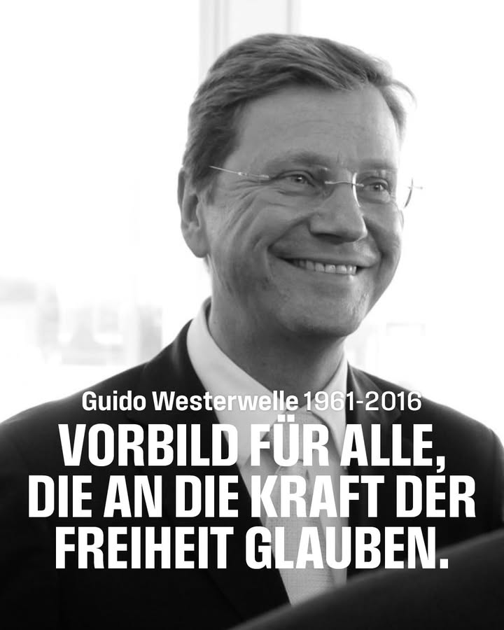 Zehn Jahre nach seinem Tod bleibt Guido Westerwelle als eine der prägenden und wichtigsten Stimmen des deutschen Liberalismus für uns unvergessen. Über viele Jahre hat er die deutsche Politik geprägt – als FDP-Generalsekretär, Partei- und Fraktionsvorsitzender sowie Bundesaußenminister. Auch in schwierigen Zeiten war er mit voller Überzeugung Freier Demokrat. Guido Westerwelle war ein engagierter Verfechter der Freiheit, der wie kaum ein anderer für eine offene und tolerante Gesellschaft eintrat. Wir ehren ihn, indem wir seinen Einsatz für die Freiheit mit derselben Entschlossenheit weiterführen, die sein Leben geprägt hat. Er bleibt ein Vorbild für alle, die an die Kraft der Freiheit glauben.